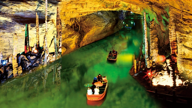 黃龍洞因相傳古代洞內(nèi)有黃龍藏身而得名,1983年經(jīng)當?shù)?個青年民兵發(fā)現(xiàn)探明,1984 年正式對外開放。因洞內(nèi)擁有高闊的洞天、幽深的暗河、懸空的瀑布、上千個白玉池、數(shù)萬根石筍。